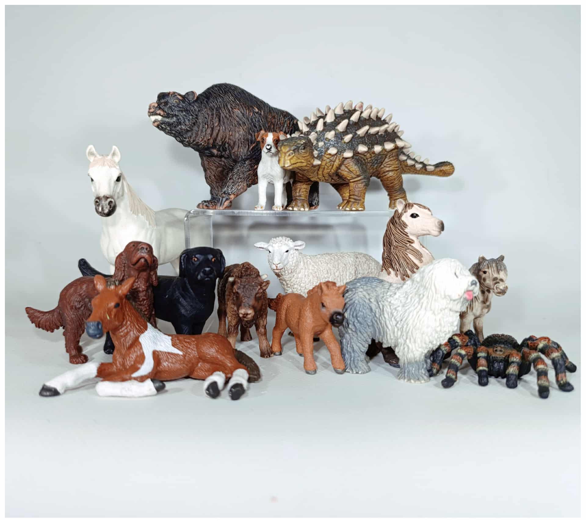 Značka Schleich a její nové produkty a já se poměrně značně rozcházíme, a tak tíhnu spíše ke starším modelům, které měly obrovskou dávku originality a osobnosti. Tak jsem si rozšířil počty o 14 kousků starších až starých modelů. Prehistorický svět zastupují dva kousci. Obrněný býložravý Saichania a již vyhynulý Medvěd jeskynní, který ovšem bude potřebovat trochu doupravit. Psí svět zastupuje poměrně dost raritní Irský setr, Bobtail, Jack Russel a černý Labrador. Všechny tyto psí modely jsou z počátku století a patří do zlaté éry této značky. Koně jsou zastoupeni ležícím Pinto hříbětem, které bylo vytvořeno pro McDonald´s z původního moldu ležícího Haflinga. Hřebec Shetlandského pony, běžící hříbě, bílá varianta Tennesseského mimochodníka a hřebec Falabelly, který dostane nový kabát. Stějně jako tele Bizona severoamerického. Domácí zvířata zastupuje krásný model ovce a svět hmyzu velmi povedený sklípkan.