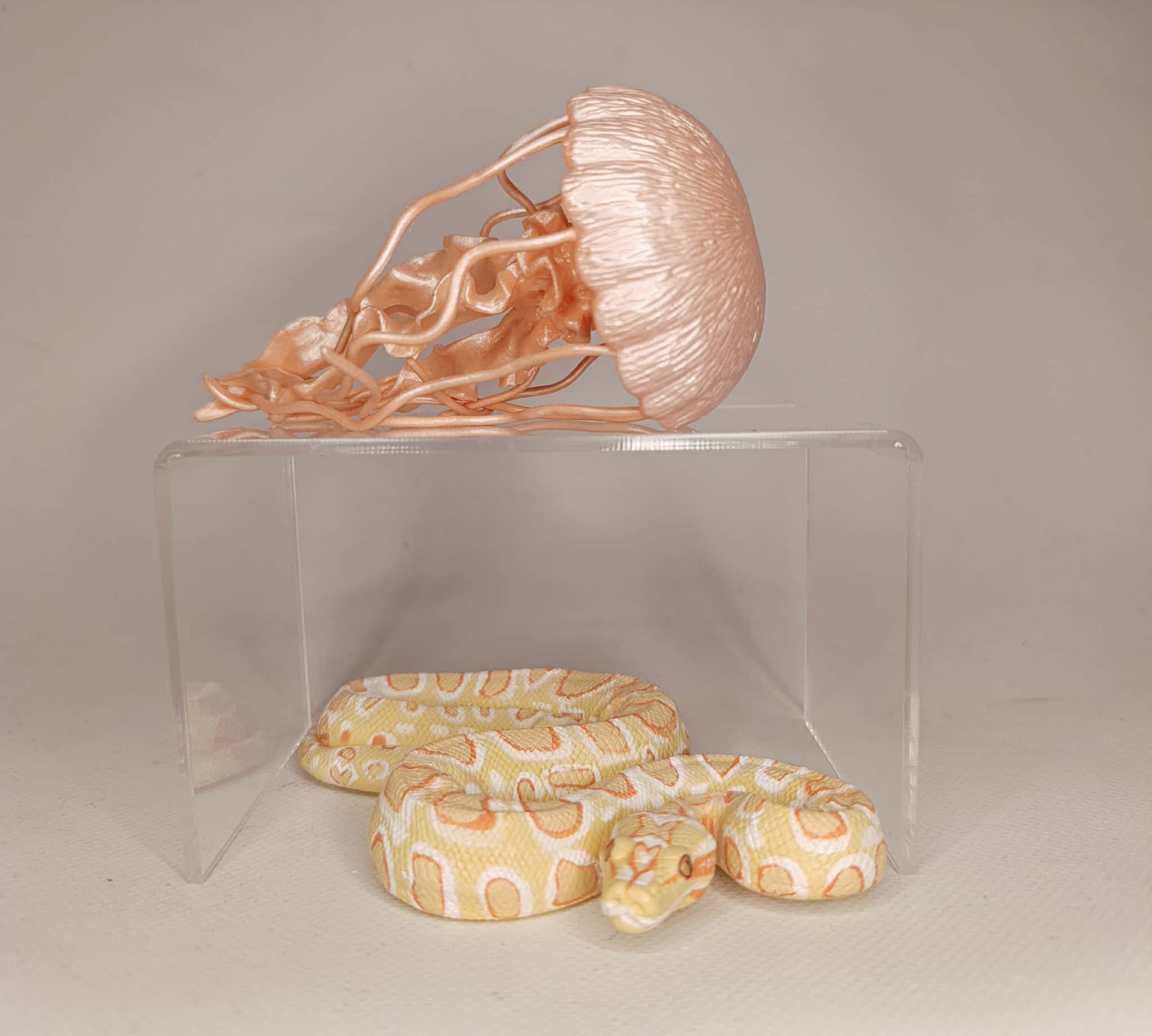 Dalším kouskem je Talířovka obrovská patřící mezi největší medůzy na světě. Ta je velkým překvapením, protože její zpracování je opravdu krásné. Materiál je krásně měkký, na dotek příjemný a její žahavá chapadla jsou pohyblivá a dají se různě tvarovat. Stejně jako závoje, které stejně jako další části modelu disponují perleťovou barvou. Ta vytváří krásný lesklý efekt.