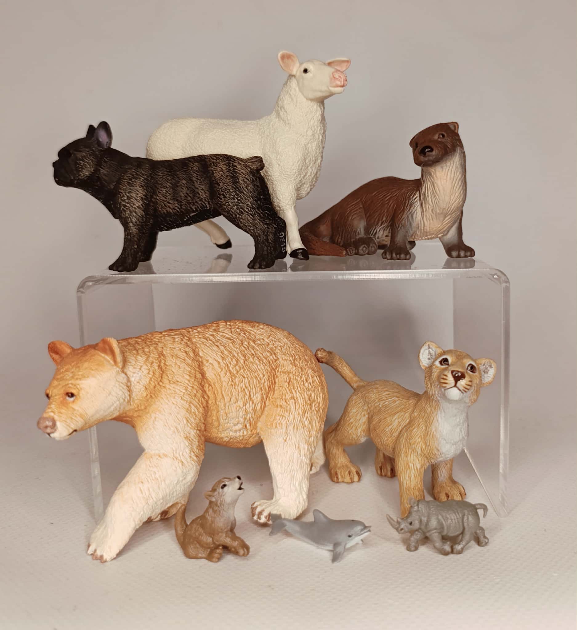 Značka Schleich a její nové produkty a já se poměrně značně rozcházíme, a tak tíhnu spíše ke starším modelům, které měly obrovskou dávku originality a osobnosti. Tak jsem si rozšířil počty o 14 kousků starších až starých modelů. Prehistorický svět zastupují dva kousci. Obrněný býložravý Saichania a již vyhynulý Medvěd jeskynní, který ovšem bude potřebovat trochu doupravit. Psí svět zastupuje poměrně dost raritní Irský setr, Bobtail, Jack Russel a černý Labrador. Všechny tyto psí modely jsou z počátku století a patří do zlaté éry této značky. Koně jsou zastoupeni ležícím Pinto hříbětem, které bylo vytvořeno pro McDonald´s z původního moldu ležícího Haflinga. Hřebec Shetlandského pony, běžící hříbě, bílá varianta Tennesseského mimochodníka a hřebec Falabelly, který dostane nový kabát. Stějně jako tele Bizona severoamerického. Domácí zvířata zastupuje krásný model ovce a svět hmyzu velmi povedený sklípkan.