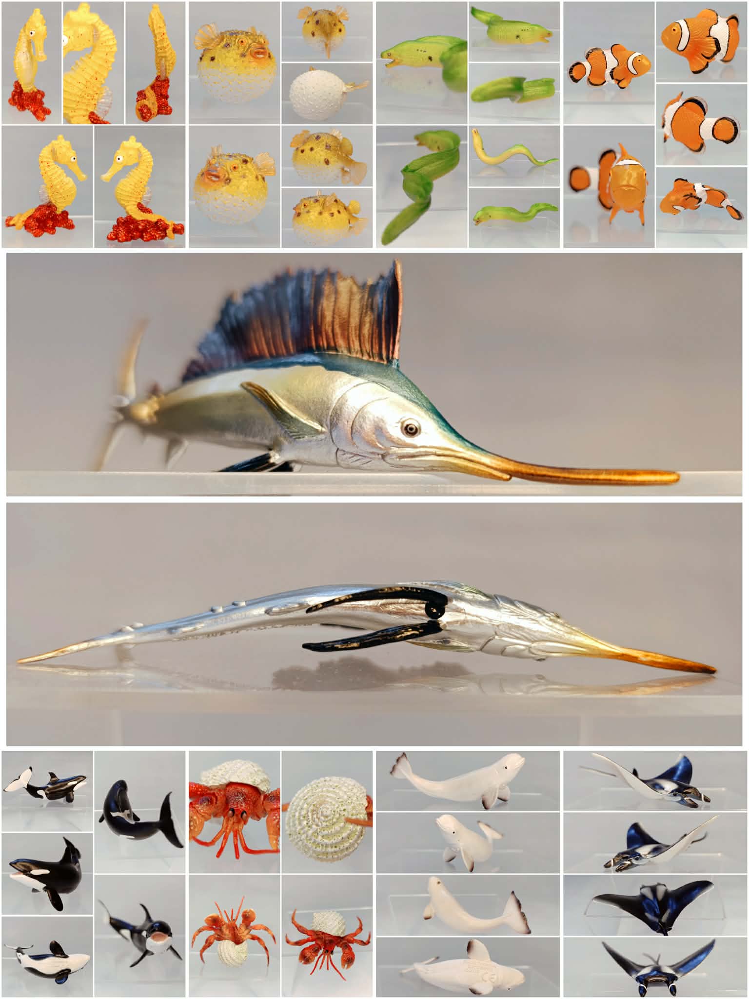 Set obsahuje: Mládě Lachtana medvědího / Čtverzubec / Muréna zelená / Siba atlanská / Siba skvrnitá / Klaun očkatý / Plachetník širokoploutvý / Mořský koník (s korálem) / Krab pustevník / mládě Delfína skákavého / mládě Běluhy severní / mládě Kosatky dravé / Piloun mnohozubý / Trnucha skvrnitá / Kytarovec křivoústý / Rejnok Manta